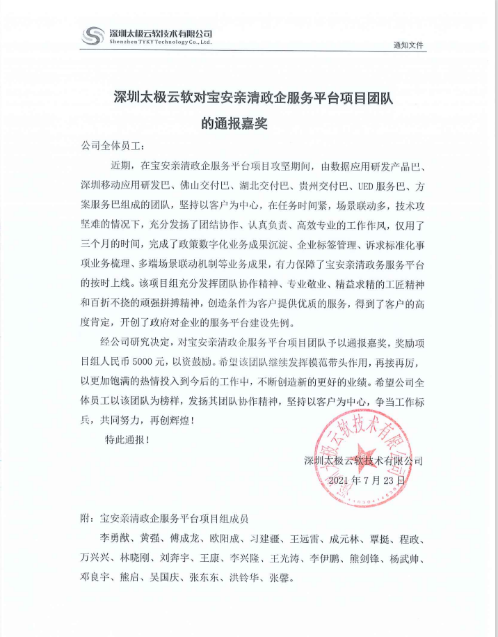 经公司研究决定,现对宝安亲清政企服务平台项目团队予以通报嘉奖。希望该团队能继续发挥模范带头作用,再接再厉,以更加饱满的热情投入到今后的工作中,不断创造新的更好的成绩。同时希望公司全体员工以该团队为榜样,发扬其团队协作的精神,坚持以客户为中心,争当工作标兵,共同努力,再创辉煌!